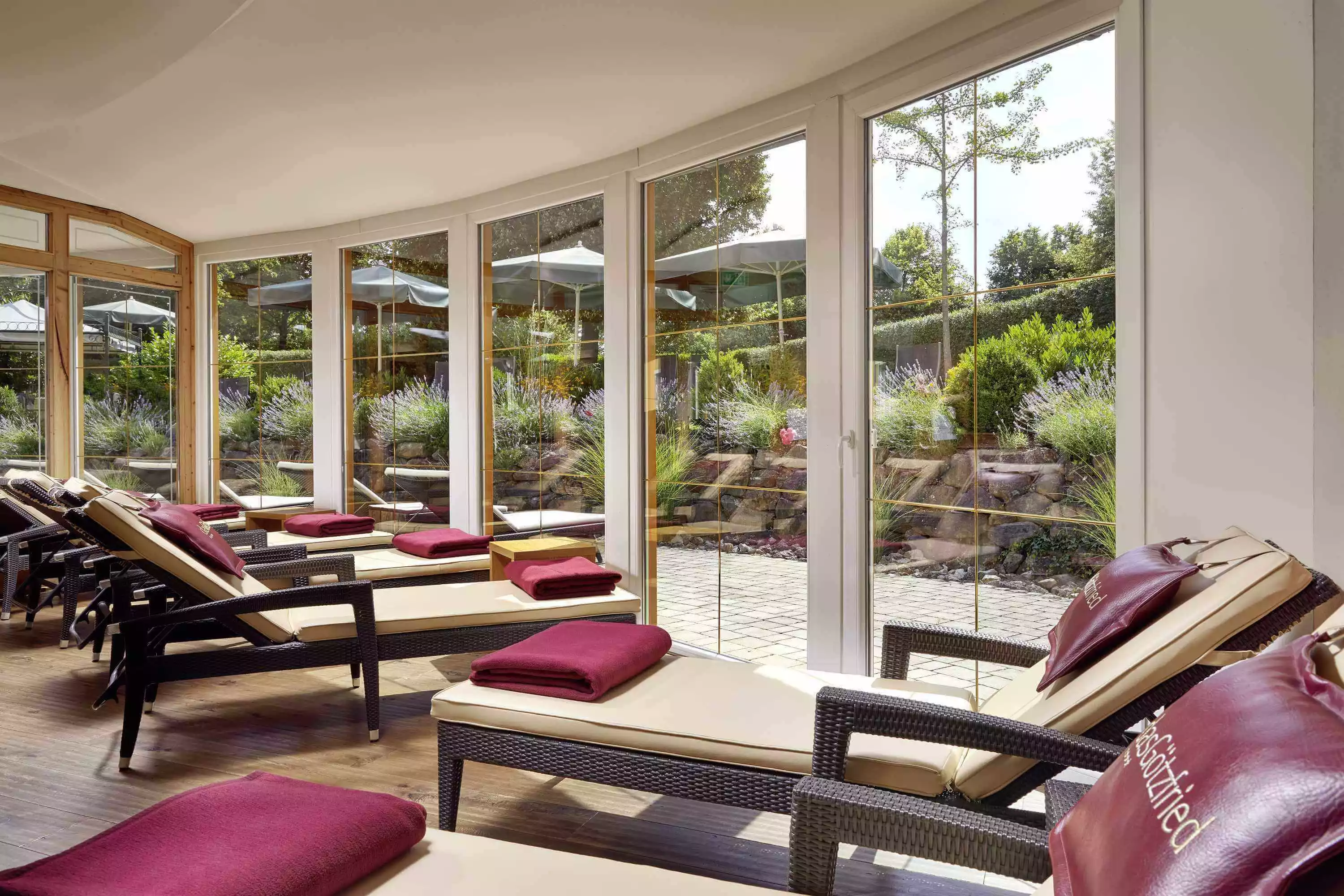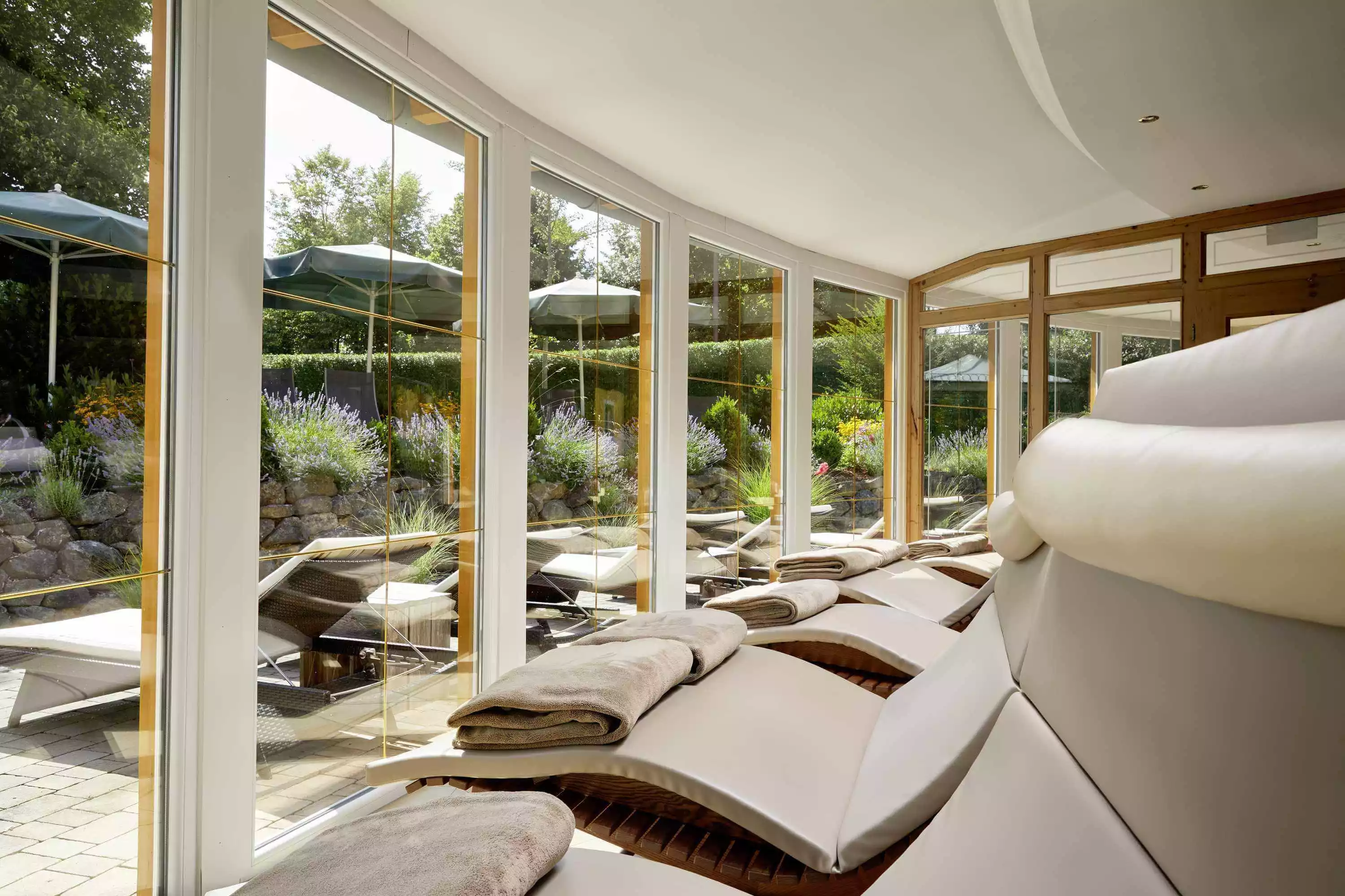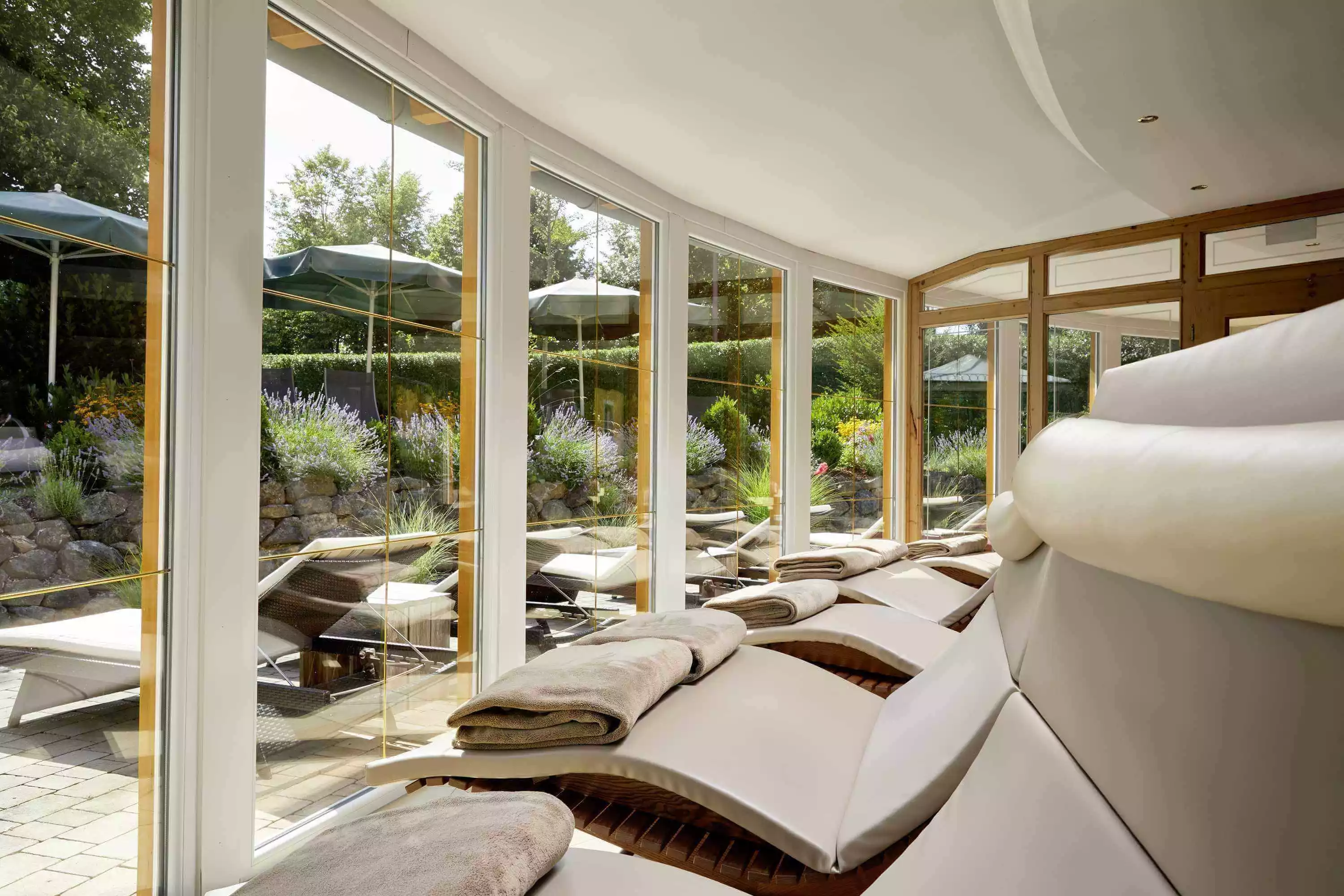 Die Panoramalounge mit ihren großen Panoramatüren ins Freie lädt zum Relaxen mit erholsamer Aussicht ins Grüne ein. Verschiedene Liegen laden zum Verweilen ein. Hinzu kommt als Highlight der großzügige Whirlpool.