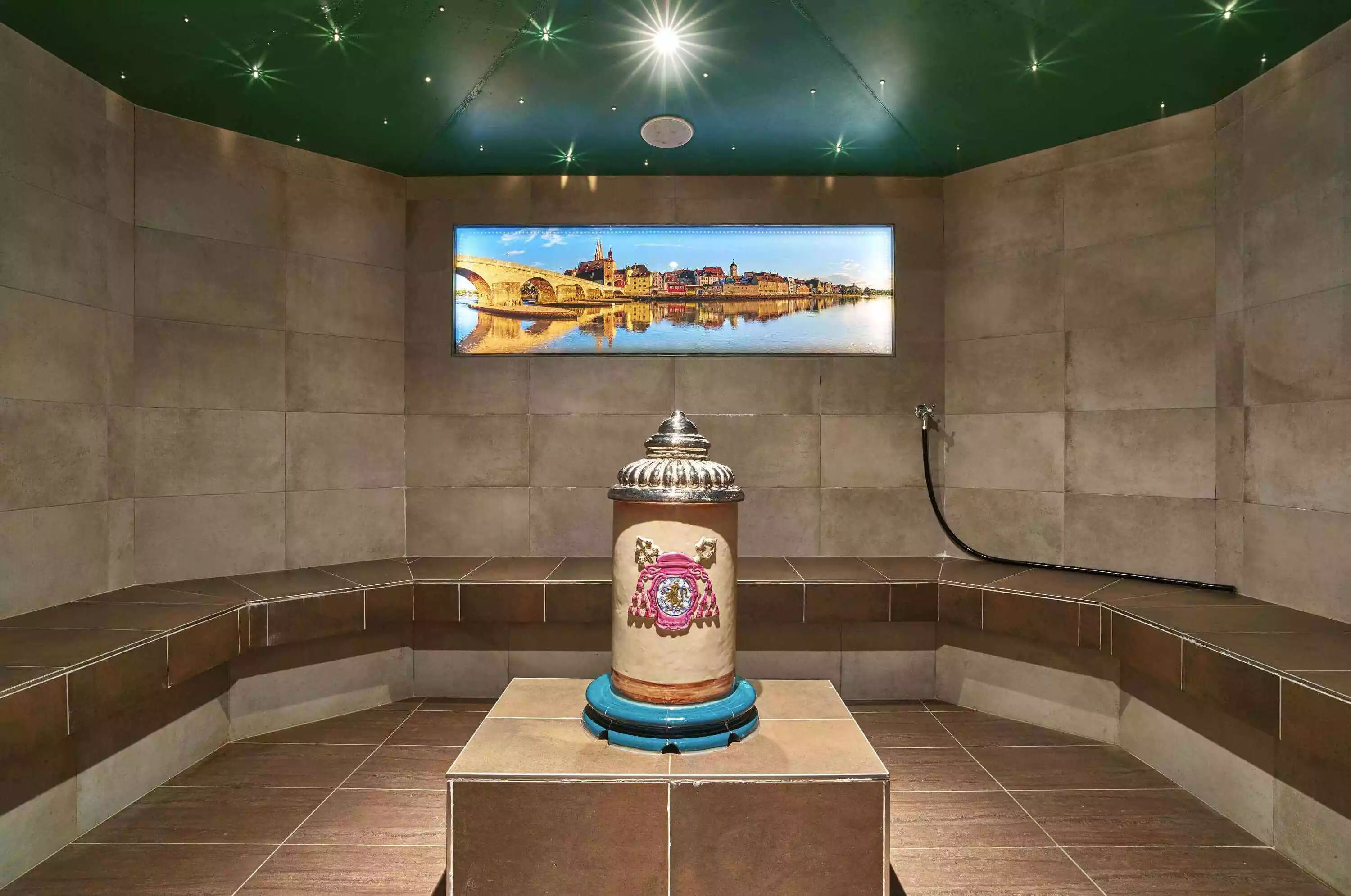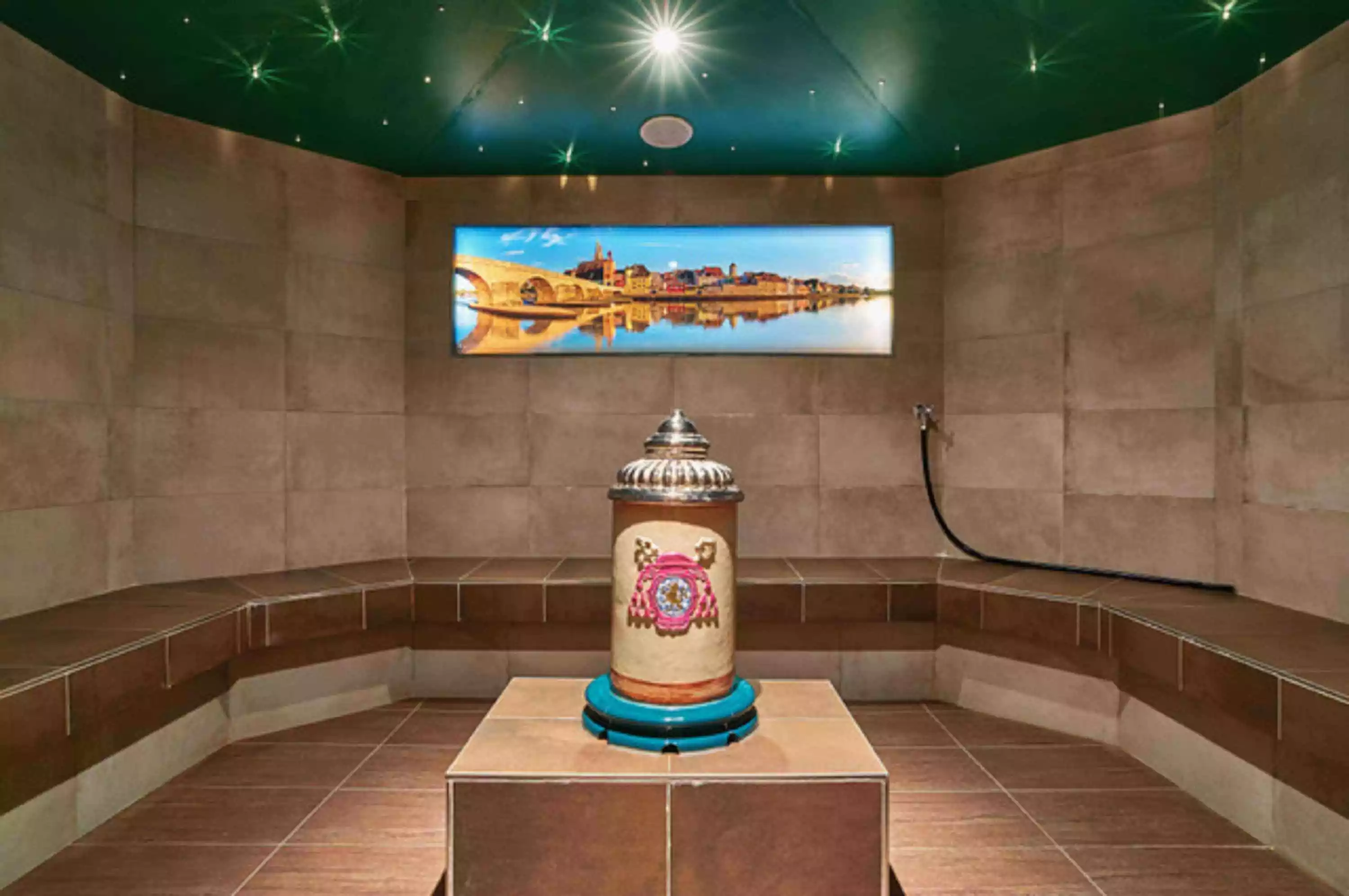 In diesem besonderen Dampfbad sorgen edle Handwerkskunst und Design für Begeisterung. Es bietet bequem Platz für 6 Personen. Das wohl Einzigartige an dieser Attraktion: Ein Riesenbierkrug aus Handkeramik sorgt für einen gelungenen Dampf-Ausstoß. Die milde Wärme geht von den Bänken aus und schenkt in Kombination mit dem leichten Dampf sanftes Wohlgefühl.