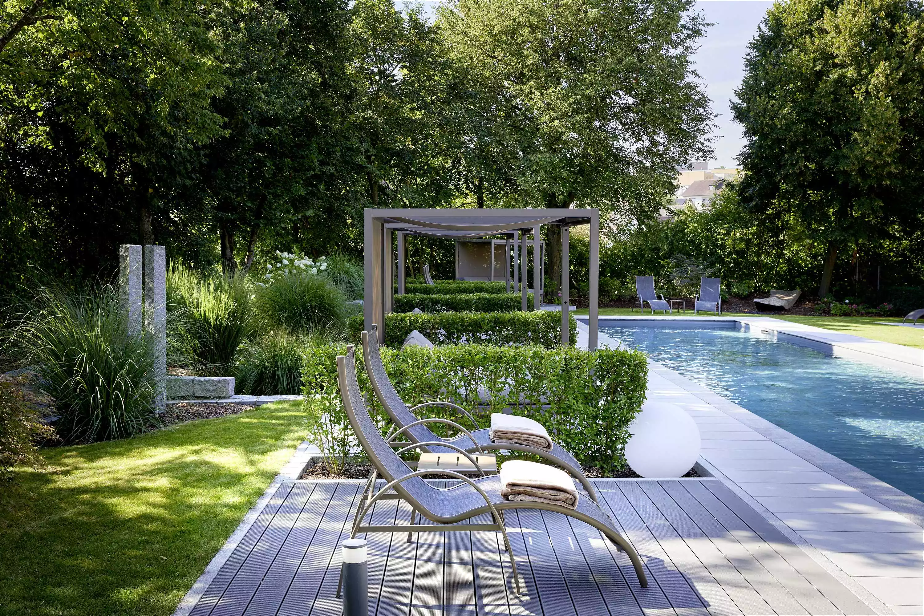 In unserem großen Wellnessgarten können Sie dem Alltag wunderbar entfliehen! Die weitläufige Wiese wurde mit vielen neuen, bequemen Möbeln ausgestattet und mit bunten Blumen liebevoll bepflanzt. Statuen und dekorative Figuren verleihen dem Garten einen individuellen Charme und das gewisse Etwas. Zahlreiche Sonnen- und Schattenliegen laden zum Verweilen ein, während Bänke und kleine Tische zu einem erfrischenden Getränk nach einem Saunagang im Regensburger Refugium verführen. Entspannen Sie im Grünen, mitten in der Stadt und genießen Sie die Ruhe und Natur in vollen Zügen.